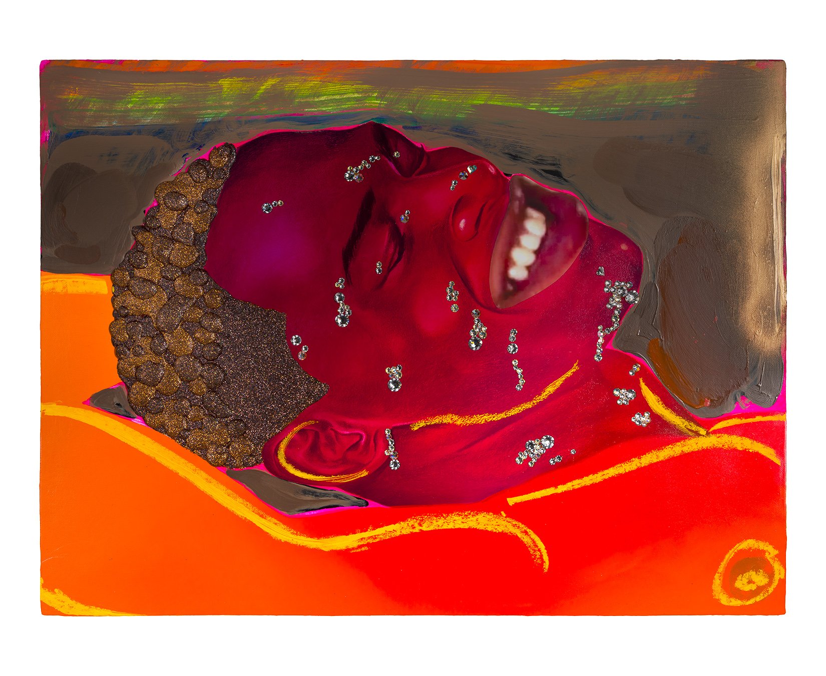 Acrylic, Oil, ink, colored pencil, glitter, sequins, Swarovski Crystal rhinestones and jewelry on canvas stretched over panel